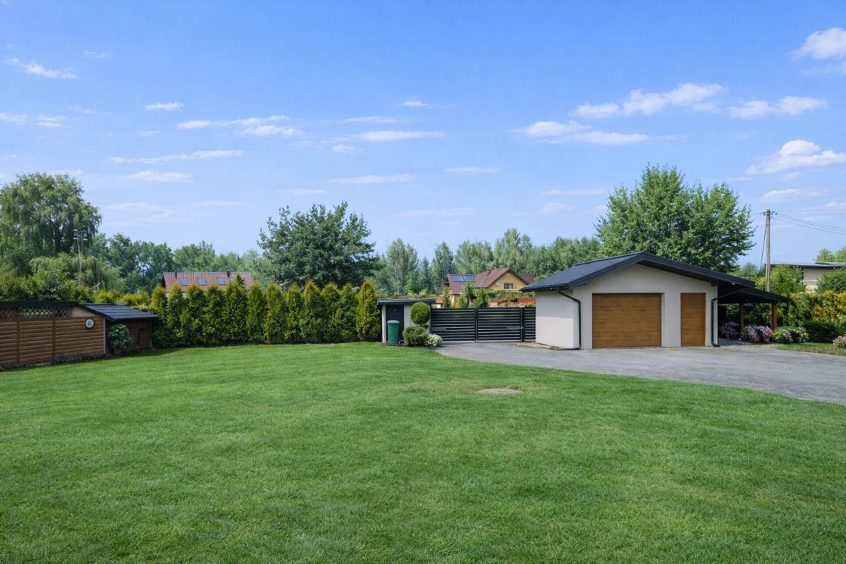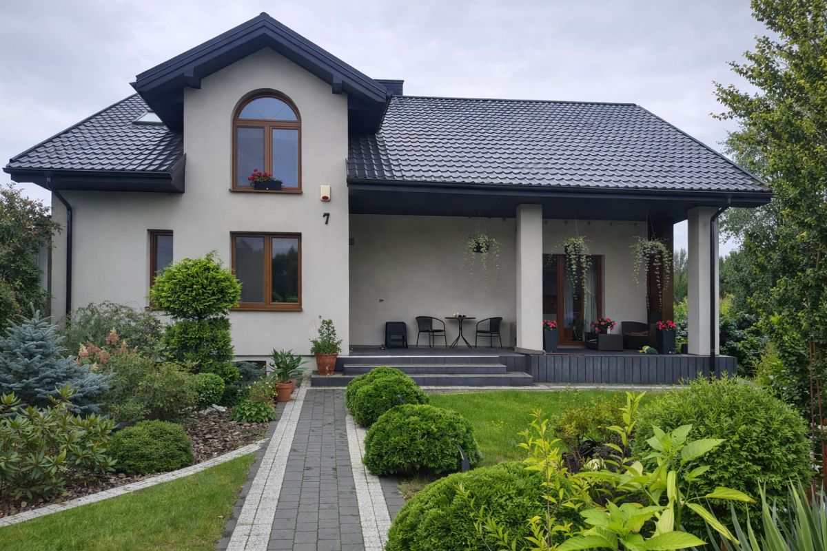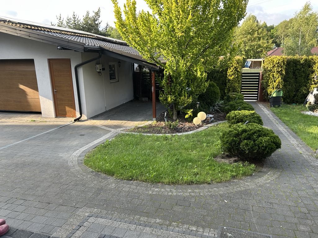 Nieruchomość znajduje się na ogrodzonej, w pełni zagospodarowanej działce z utrzymanym ogrodem, licznymi nasadzeniami oraz reprezentacyjnym wejściem wyłożonym kostką brukową.