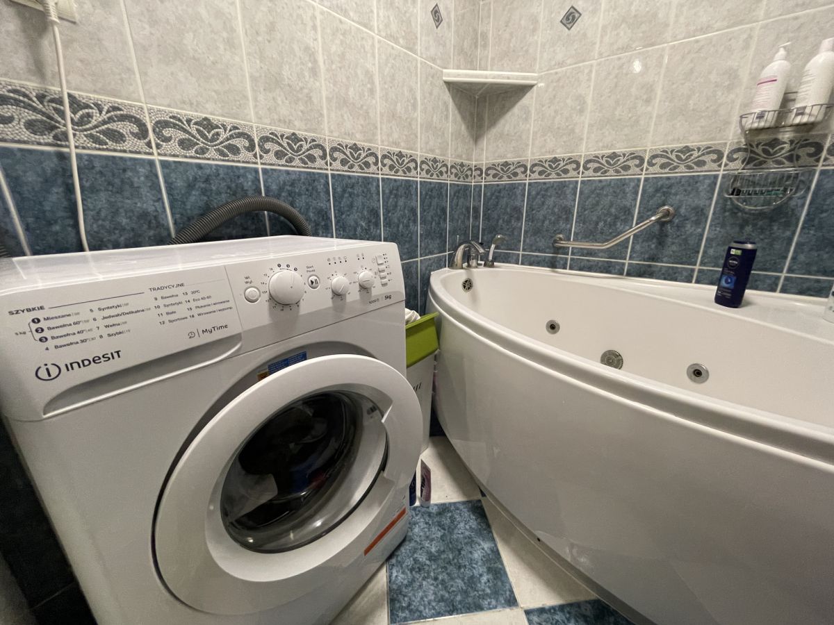 - w łazience: umywalka, wanna, pralka, WC, suszarka